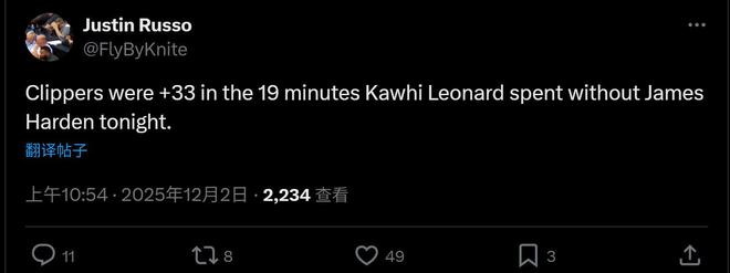 快船随队记者Justin Russo赛后又发文拱火,指出在哈登没登场的19分钟里面,小卡单独带队赢了33分,明牌球队输球责任在哈登。