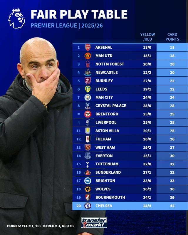 【24+4】切尔西本季英超已有24张黄牌、4张红牌(上赛季联赛总计只有2红),在英超公平竞赛积分榜垫底。阿森纳则在这份榜单居首,不过他们对阵蓝军这1场比赛就吃到6张黄牌,占开季以来黄牌总数的1/3。